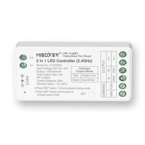 Mi-Light Kontroler 2.4GHz za enobarvni in CCT LED trak -PUSH+RF je primeren za zatemnjevanje LED trakov s konstantno napetostjo (12/24VDC) v kombinaciji z napajalnikom.